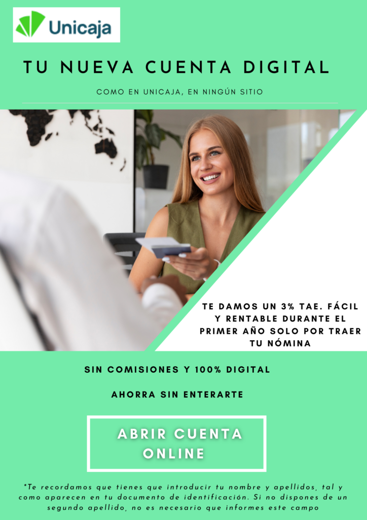 Al abrir la Cuenta Digital de Unicaja y domiciliar tu nómina o pensión de al menos 600 € al mes, puedes obtener 3% TAE sobre los primeros 20.000 € durante el primer año.