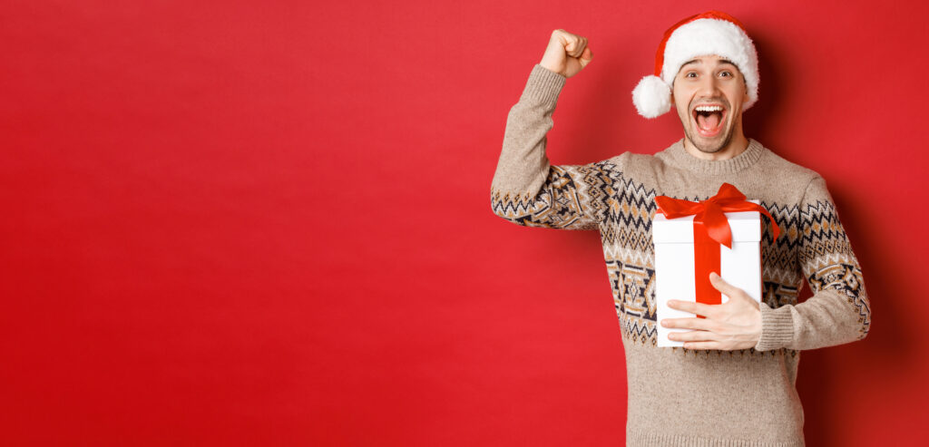 Image of happy and excited handsome man, reicing christmas gift, raising hands up in triumph and smiling, celebrating new year, standing over red background in santa hat.