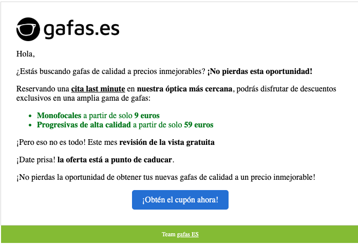 Para dar un ejemplo concreto, a continuación hemos destacado una oferta de las gafas monofocales completas por 9 €, diseñadas para atraer clientes con productos funcionales a precio reducido.